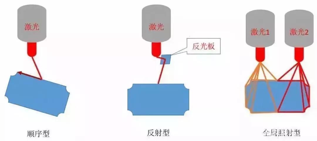 根據(jù)激光發(fā)射設備的構(gòu)造不同,激光的照射方式可以分為順序型、反射型以及全周照射型。