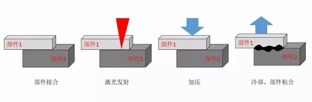 首先,將兩個部件安裝到治具上并加緊;其次,通過控制設備發(fā)射激光,確保在部件界面處生成足夠的熱量使得塑料熔化;再次,通過對部件施加一定的壓力,將兩個部件熔融的部分因在擠壓作用下融為一體;最后,通過關閉激光照射,保持一定的壓力一段時間,使得兩部件冷卻,最終實現(xiàn)