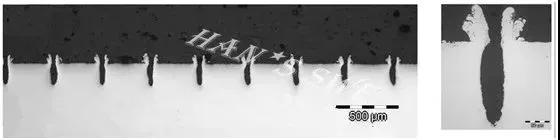 激光直接連接金屬與塑料首先需要金屬表面處理,通過(guò)在該區(qū)域掃描激光并局部燒蝕材料,在金屬表面上形成帶槽的微觀結(jié)構(gòu)。 凹槽可以小到幾微米寬,而通過(guò)在同一區(qū)域上多次掃描激光可以改變深度。使用高頻脈沖激光器在金屬表面加工出深槽后,使用治具壓合金屬與塑料,利用連續(xù)激光加熱熔化結(jié)合處塑料后形成有效連接。
