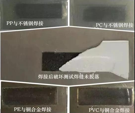 通過(guò)測(cè)試,各類(lèi)熱塑性塑料均可與不銹鋼、鋁合金、銅合金等實(shí)現(xiàn)連接,焊接后破壞拉伸測(cè)試焊縫不脫落,焊接強(qiáng)度可高于塑料母材強(qiáng)度。